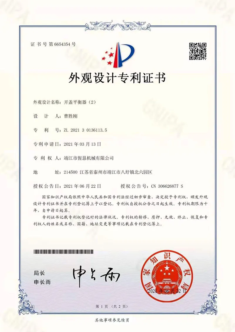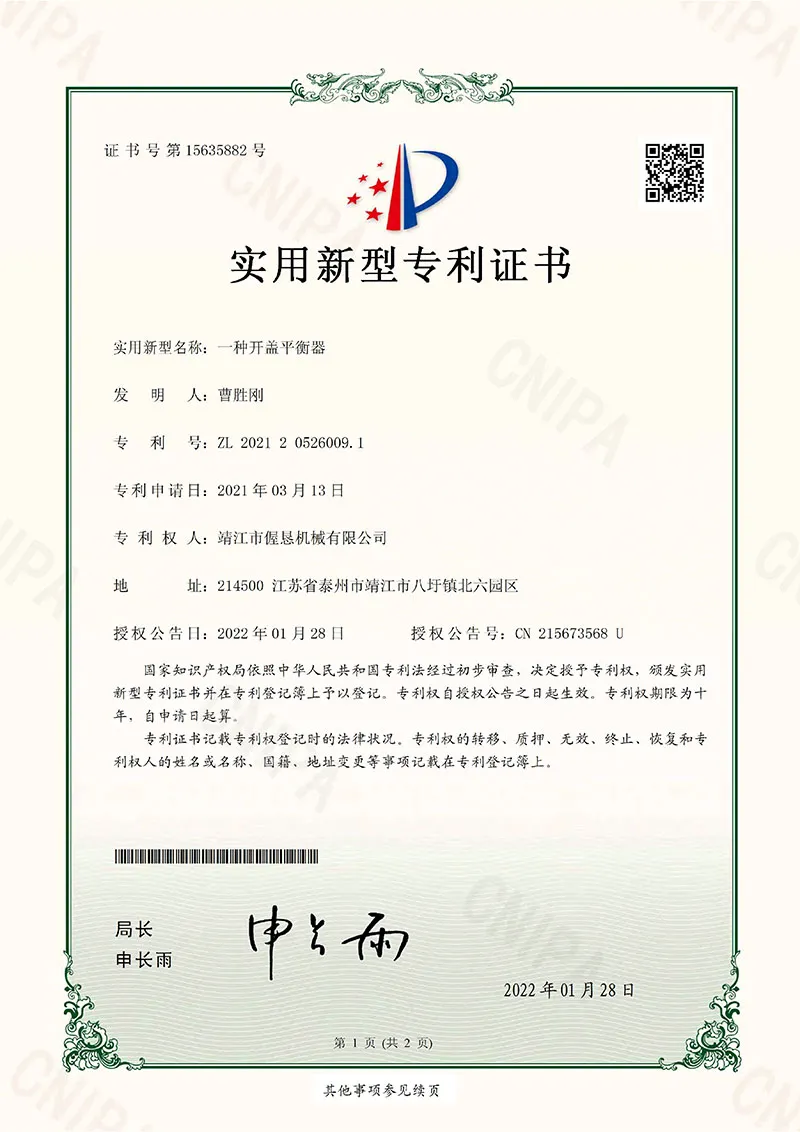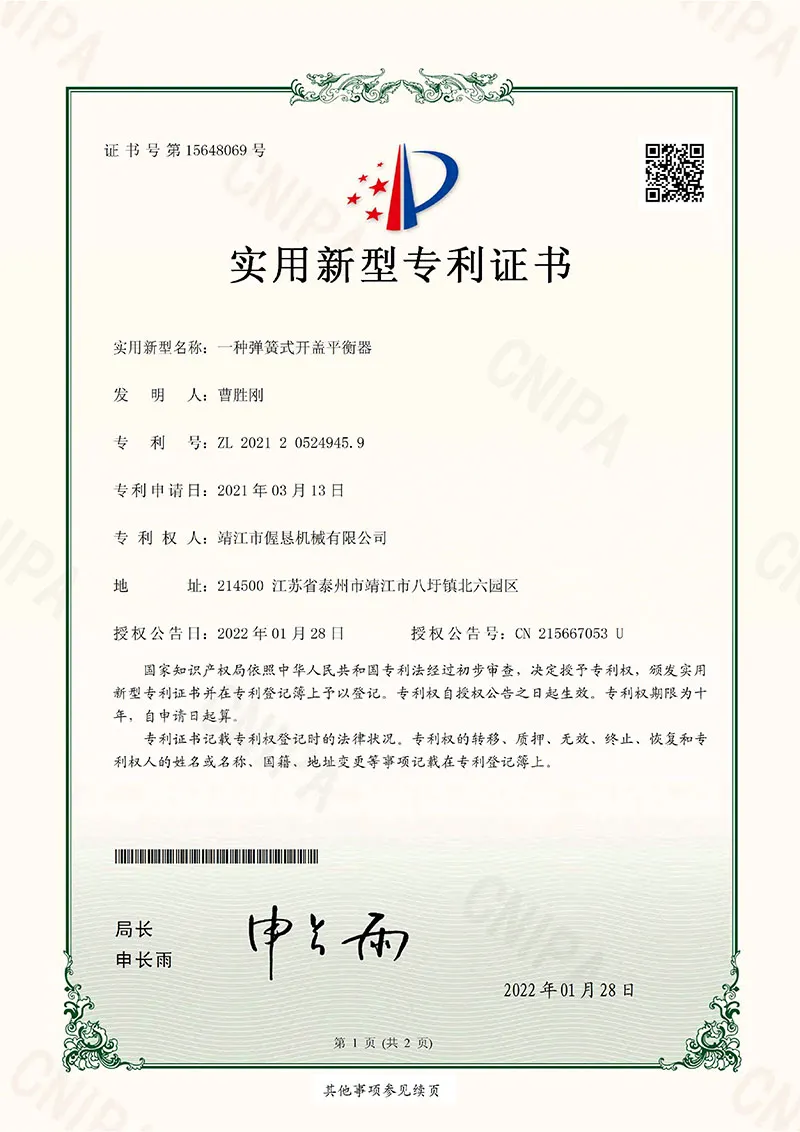 • 1Patent -Zertifikat für den Ausgleicher der Deckelöffnung